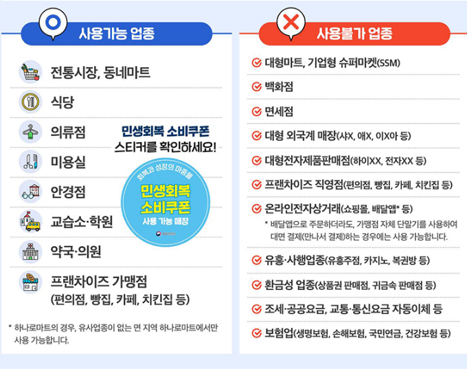민생소비쿠폰은 전통시장과 소형 마트,식당, 미용실과 프랜차이즈 가맹점 등 소상공인이 운영하는 가게에서 사용가능합니다. 또한 안경점, 병원,약국,의원 등 의료 목적으로 사용하거나 교습소와 학원등 학습 목적으로도 사용 가능합니다.